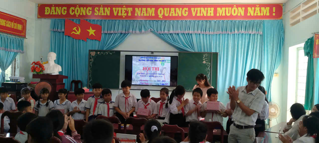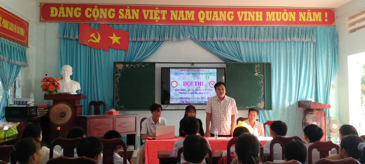 Nhằm động viên học sinh tham gia tích cực vào các hoạt động tìm hiểu Luật an toàn giao thông để bước đầu có được những kiến thức, kỹ năng về an toàn khi tham gia giao thông, giúp các em có kiến thức về việc phòng chống ma túy. Sáng nay ngày 29 tháng 11 năm 2025 Liên Đội Trường Tiểu học Vĩnh Thuận 1 xây dựng tổ chức Hội thi An toàn giao thông-phòng chống ma túy cấp trường năm học 2025 – 2026