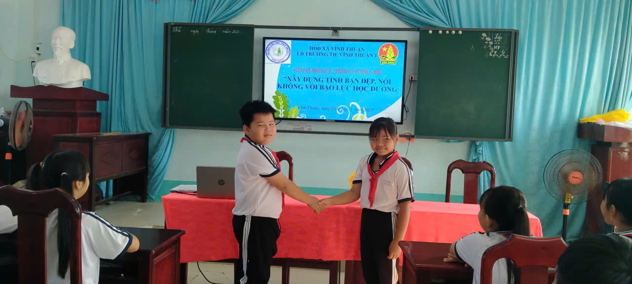 – Căn cứ vào chương trình công tác Đội và phong trào thiếu nhi năm học 2025 – 2026 của Liên đội trường tiểu học Vĩnh Thuận 1; Sáng ngày 3 tháng 11 năm 2025 Liên Đội trường TH Vĩnh Thuận 1 tiến hành triển khai nội dung sinh hoạt theo chủ điểm: “Xây dựng tình bạn đẹp, nói không với bạo lực học đường” gắn với tuyên truyền an toàn mạng, pháp luật và an toàn giao thông.
